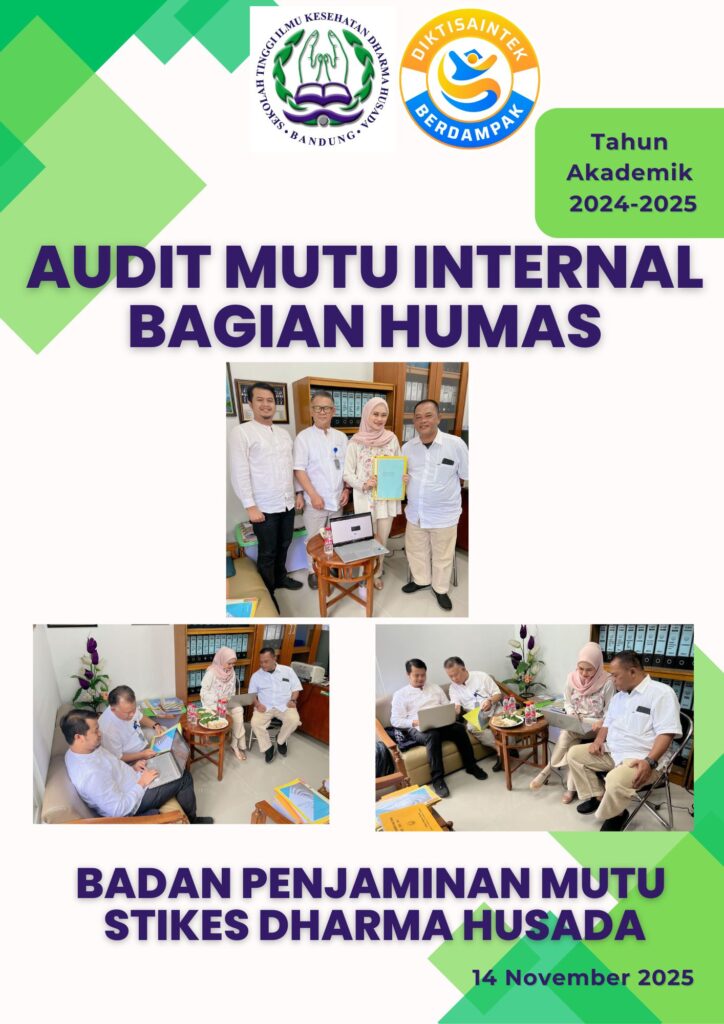 AMI bagian Humas STIKes Dharma Husada dilaksanakan pada hari Jum’at/14 November 2025 , yang bertugas menjadi lead auditor Ejeb Ruhyat, SKM., MKM ditemani dengan anggota tim : Bdn Metha Tamara ,S.ST.,M.KM